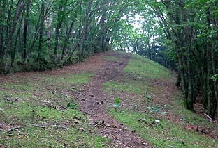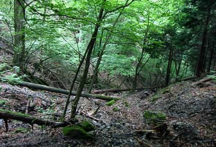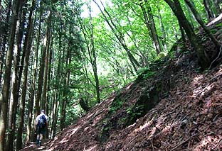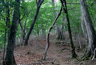 ← | 杉林の急登を過ぎるとやや登りは緩やかになる ※鹿の食害の影響か、下草はほとんど生えていない |
