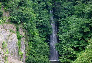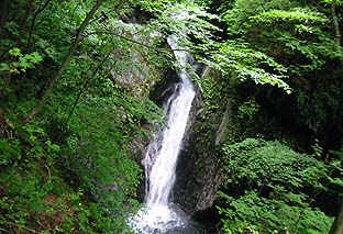 林道から見る百尋ノ滝の上にある滝(無名滝) ※落差は20m程度、水量が多く見応えがある |