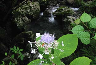 栃寄集落へ向かう車道から登山道入口分岐付近 ※沢筋にはタマアジサイが多く、花の時期 |