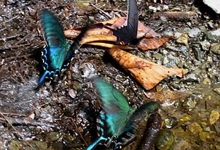 ← | 林道の水のある場所にはチョウが吸水に集まる ※写真はカラスアゲハとクロアゲハ |