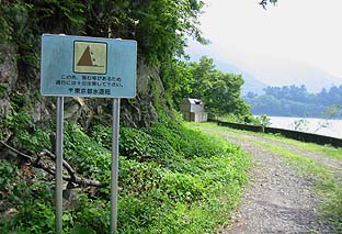南岸歩道入り口 ※ゲートと落石注意の看板がある |
