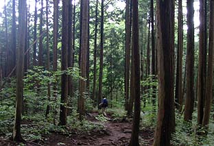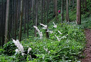 ← | しばらくはスギ・ヒノキの林を中を登る ※花はサラシナショウマ(多い) |