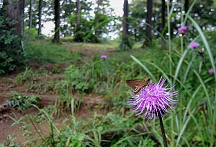 大塚山頂は疎林 ※樹間から川乗山方面の展望が得られる ( ノアザミに止まっているのはイチモンジセセリ ) |