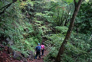 岩場を交えた急傾斜の道 ※大岳山の両側は急傾斜となっている |
