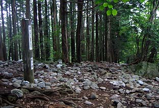 鋸山頂 ※植林帯の中で展望は皆無 (転がっている石はボッカ訓練の遺物) |