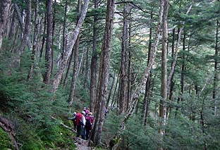← | 雲取山北面の巻き道 ※ここは都内唯一の亜高山性の針葉樹の原生林 |