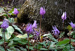 カタクリ(御前山東側面) ※三山縦走の主眼はカタクリ分布域の確認を。 三頭山〜月夜見山では全く確認できず、小河内峠先から御前山〜大ダワ間では断続的に分布。一部の箇所を除き密度は薄い。 大ダワ先と鍋割山手前にも分布域あり。 花はほとんどの分布地で開花状態、標高による咲き具合に大きな差は見られなかった。 |