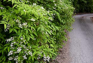 しばらくは大丹波林道(一部未舗装)を行く ※道脇ではヒメウツギの花が咲き始めていた (林道脇では最も多く繁茂している) |