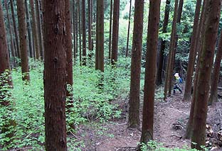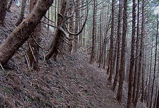 ← | 山頂からは植林帯の急降下が続く ※下方まで来ると灌木が繁茂している |