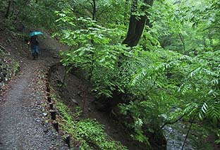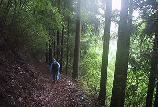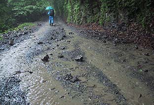 後山林道は長い道のり ※今日は大雨で所々水が流れ出ている |