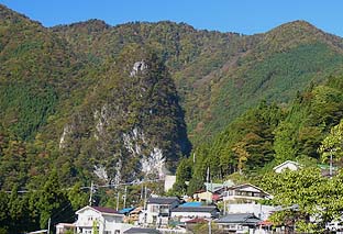 ← | 日原集落と稲村岩 ※バス停手前から見る |