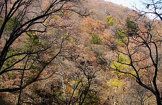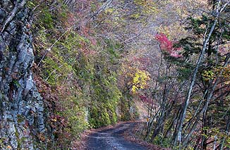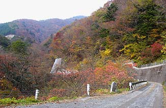 ← | 小菅林道(1kmくらい進んだ地点) ※紅葉の盛りだが色にそれ程鮮やかさはない ※バスの終点から小菅林道終点までは7kmくらいの道のりとなる。 |