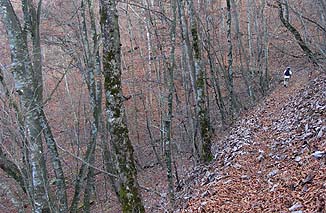 雄滝へは林道分岐から谷沿いを行く ※周囲は深いシオジの林となる(既に落葉) |