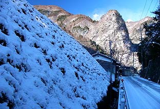 東日原から5分くらい街道を行くと登山口となる ※この家並みの先を左に入る ※正面には見えるのは稲村岩 |