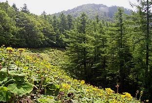 ブナ坂から見る七つ石山 ※周辺はマルバダケブキの大群落 |