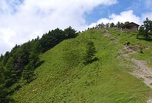 ← | 雲取山頂脇の避難小屋 ※左下はマルバダケブキの群落 |