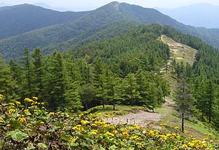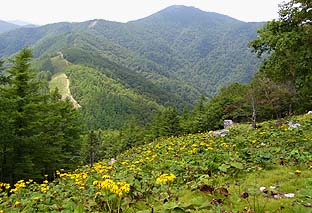← | 七ツ石山頂から雲取山を振り返る ※手前斜面はマルバダケブキの大群落 |