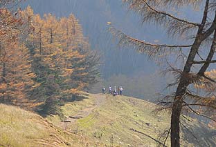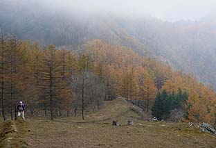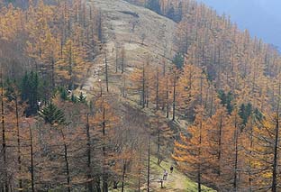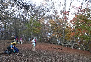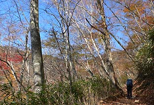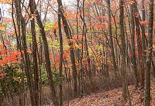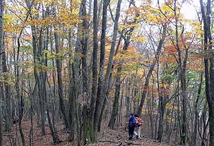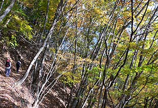 ← | 登るに従い、木々の色づきは増す ※ミズナラ主体の樹林帯 |