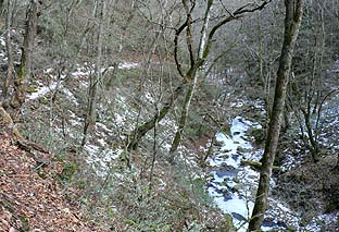 ← | 唐松谷最上部:谷はかなり氷結している ※谷に降りるとしばらくは谷の近くを歩く、この後は谷から離れ、急斜面のトラバース道が続く |